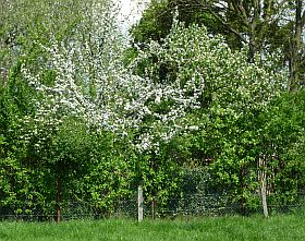 Ansonsten blühen die Goldparmänen traumhaft; der vor drei Jahrenaufgepfropfte Gravensteiner blüht das erste Mal, und gleich richtig gut. Ständig sind Bienen an den Blüten - an der Bestäubung fehlt es wahrlich nicht. Hoffen wir, daß uns ein gutes Apfeljahr bevorsteht!