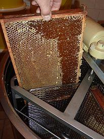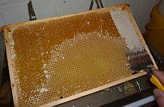 Die Wabe wird bienenfrei gemacht und mit anderen zusammen in den Schleuderraum transportiert. Dort werden die Wachsdeckelchen, mit denen die Bienen den Honig versiegelt haben, mit der "Entdeckelungsgabel" abgehoben, auf beiden Seiten der Wabe.