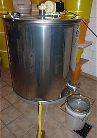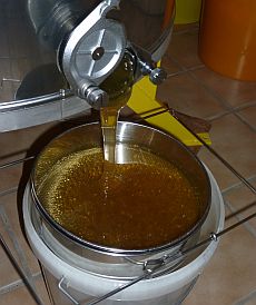 Der Honig läuft durch ein Doppelsieb in den Eimer. Das Grobsieb filtert größere Wachsteile heraus, während das Feinsieb die kleineren Partikel zurückhält. Trotzdem gelangt noch das eine oder andere Wachskrümelchen durch das Sieb. Ausserdem bilden sich auch Luftbläschen auf der Oberfläche des Honigs. Bevor er weiterverarbeitet werden kann, muß der Honig eine Weile ruhen, damit die kleinen Partikel und die Luftbläschen an die Oberfläche steigen können und dort "abgeschäumt" werden können.