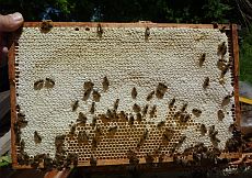 Aus einer solchen Honigwabe erntet man garantiert reifen Honig: Fast alle Honigzellen sind verdeckelt. Die Bienen haben die Wabe schon fast ganz verlassen - ihre Arbeit ist gemacht! Die Schleuder kann gedreht werden!