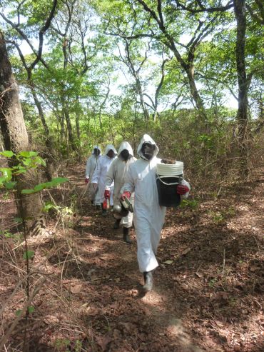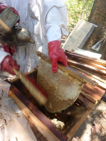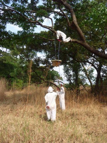 Der Umgang mit der adansonii ist aber nicht einfach. Imkern nach mitteleuropäischem Vorbild macht sie nur zögerlich mit. Der Aufbau der Imkerei findet über Schwärme statt, die in hoch aufgehängte Kisten einziehen. Diese muss man dann bergen und in die größeren TBH umsiedeln.