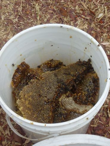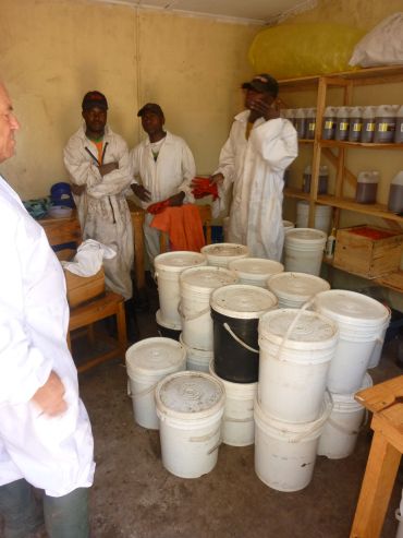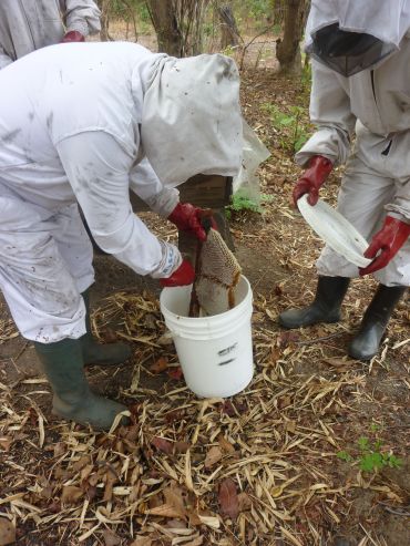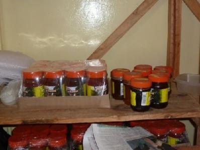 Die Tagesernte. In der "Honigstation" werden die Waben gestampft. Anschliessend lässt man den Honig durch Siebe tropfen. sodann ruht er mehrere Tage und klärt in dieser Zeit - Wachsreste und Luftbläschen steigen nach oben und werden "abgeschäumt". Nun kann man den Honig auf Gläser füllen. Das Endprodukt kann sich übrigens in punkto Sauberkeit, Konsistenz und Geschmack durchaus mit deutschem Honig messen!