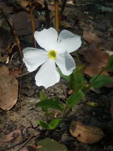 Zum Abschluß noch ein Blumengruß. Klein, keine Handbreit hoch und auf den ersten Blick nichts Besonderes, aber: fünf Monate hatte es nicht geregnet; alles war ausgedörrt von Hitze und knochentrocken, der Boden voller Risse. Die Buschfeuer waren über ihre Wurzel hinweggegangen, die im Boden ruhte. Und mit einem Mal wußte sie, dass der richtige Zeitpunkt gekommen war, auszutreiben. Nun stand sie in ihrer schlichten Schönheit auf einem Platz, der ansonsten fast trostlos grau von Asche und braun von welkem Laub war.