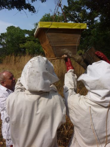 Die Mannschaft macht sich auf zur Honigernte. Alles wird bereit gehalten: Smoker, Besen und Honigeimer...