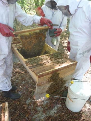 Wie bei uns auch: Die Honigwabe wird mit dem Besen bienenfrei gemacht.