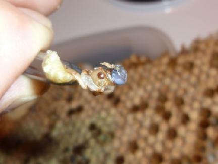 Voilà! Mehrfach parasitierte Drohnenpuppe. Bei dieser kurzen und unsystematischen Untersuchung war nahezu jede vierte Puppe befallen!